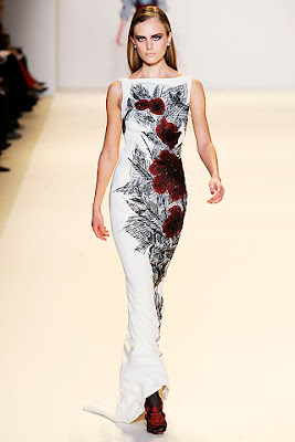 There are occasionally moments in my life in New York when I feel like I want to pinch myself to make sure they are real and attending Carolina Herrera's Fall 2010 fashion show yesterday morning was one of them. It was definitely a dream come true and also one that didn't disappoint. It's one thing to check out the photos online after a show but it's quite different to experience it in person and watch the movement of the clothes and hear the music. It was seriously magical!Mrs. Herrera for once didn't mention an artist or photographer in her program notes as the inspiration for her collection. Instead, it was a woman with "alluring confidence" who inspired her for Fall 2010. "A sophisticated feminine attitude and striking details reveal an integrity to luxury." And while she says it was a woman who inspired her, I couldn't help but think of her living room when I saw the coat above come down the runway. Maybe the confident woman who inspired her also lives in a fabulous home like herself. Actually, I can bet on it! Enjoy!